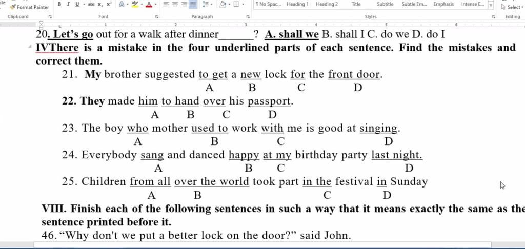 22. B: to hand -> hand (make sone do sth)