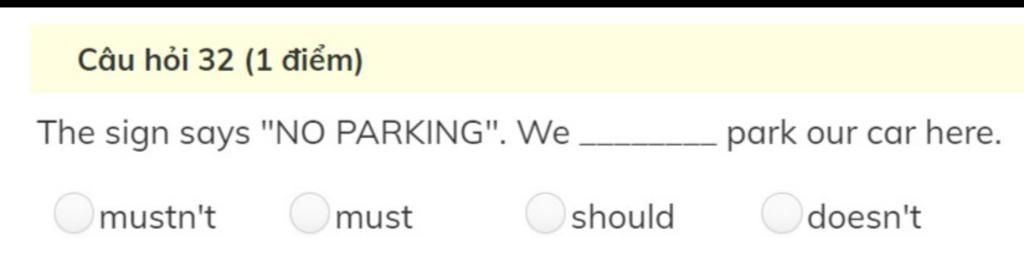 Vì Biển báo là No parking: không đậu xe nên chúng ta xài mustn't là đúng nhất.