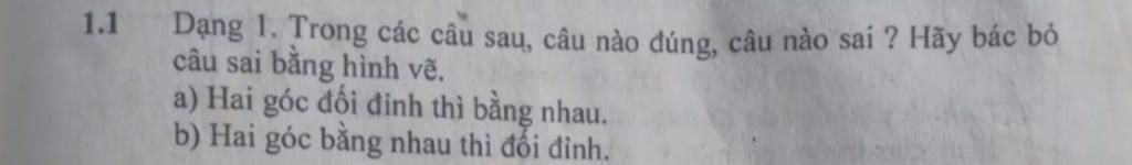 `b,` Sai. Hai góc phái dưới bằng nhau nhưng cạnh của góc này ko phải là tia đối của cạnh góc kia nên không đối đỉnh. (Hình vẽ phía dưới)