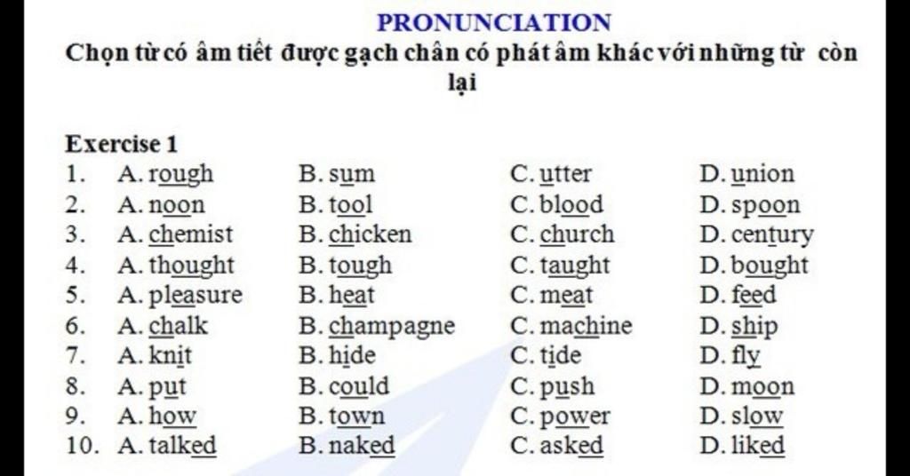 ---> Đáp án A vần "ch" phát âm là /k/ , còn lại phát âm là /CH/