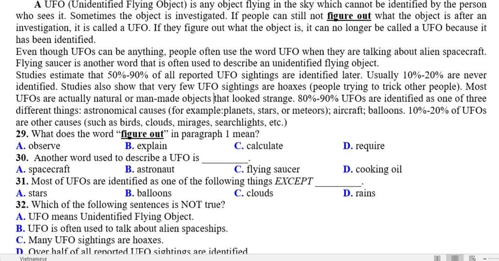 A UFO (Unidentified Flying Object) is any object flying in the sky which cannot be identified by the person