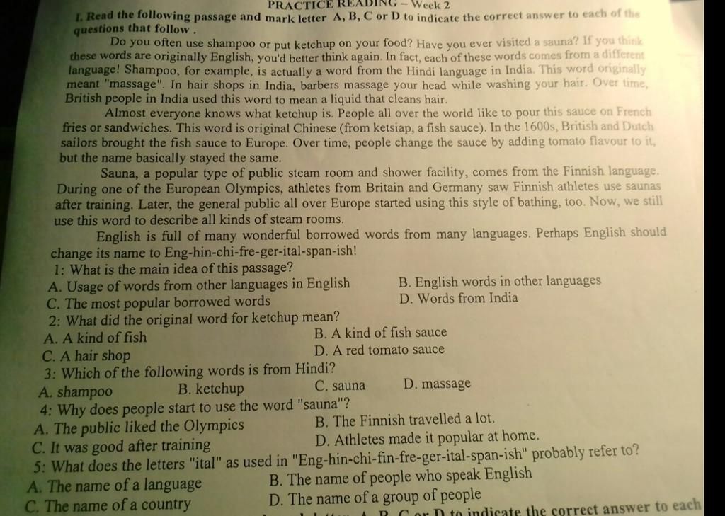 Dịch: Bạn có thường dùng dầu gội đầu hay cho sốt cà chua vào thức ăn của mình không? Bạn đã bao giờ đến thăm một phòng tắm hơi? Nếu bạn nghĩ những từ này nguyên gốc là tiếng Anh, tốt hơn bạn nên suy nghĩ lại. Trên thực tế, mỗi từ này đến từ một ngôn ngữ khác nhau! Dầu gội, chẳng hạn, thực sự là một từ trong tiếng Hindi ở Ấn Độ. Từ này ban đầu có nghĩa là "mát xa". Trong các cửa hàng tóc ở Ấn Độ, thợ cắt tóc massage đầu cho bạn trong khi gội đầu. Theo thời gian, người Anh ở Ấn Độ sử dụng từ này để chỉ một chất lỏng làm sạch tóc. Hầu hết mọi người đều biết nước sốt cà chua là gì. Mọi người trên khắp thế giới thích rưới nước sốt này lên khoai tây chiên hoặc bánh mì sandwich. Từ này là tiếng Trung Quốc nguyên bản (từ ketsiap, một loại nước mắm). Vào những năm 1600, các thủy thủ người Anh và người Hà Lan đã mang nước mắm đến châu Âu. Theo thời gian, người ta thay đổi nước sốt bằng cách thêm hương vị cà chua vào, nhưng tên gọi về cơ bản vẫn giữ nguyên. Trong một kỳ Thế vận hội châu Âu, các vận động viên từ Anh và Đức đã chứng kiến các vận động viên Phần Lan sử dụng phòng tắm hơi sau khi tập luyện. Sau đó, công chúng trên toàn châu Âu cũng bắt đầu sử dụng kiểu tắm này. Bây giờ, chúng tôi vẫn dùng từ này để mô tả tất cả các loại phòng xông hơi ướt. Tiếng Anh có rất nhiều từ mượn tuyệt vời từ nhiều ngôn ngữ. Có lẽ tiếng Anh nên đổi tên thành Eng-hin-chi-fre-ger-ital-span-ish!