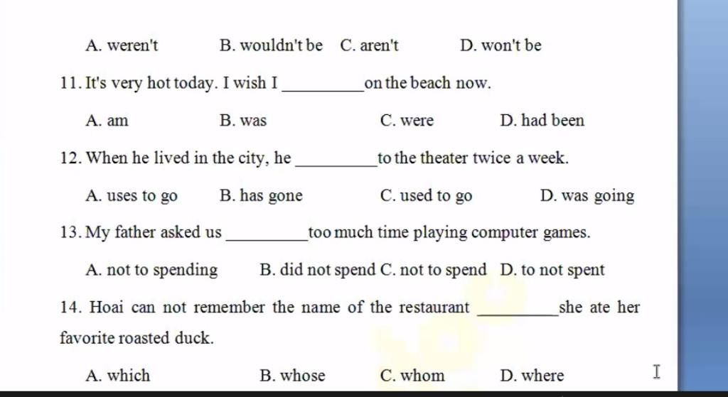${11.}$ B ( câu điều ước ở hiện tại: S+ wish(es) + S + V2/ed )