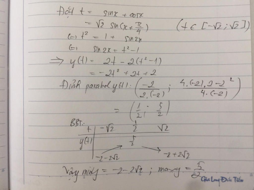 \(y=2\sin x+2\cos x-2\sin2x\\\quad=(2\sin x+\cos x)-2.2\sin x\cos x\\\quad=2(\sin x+\cos x)-4\sin x\cos x.(1)\\\text{Đặt }t=\sin x+\cos x\quad(|t|\le \sqrt{2})\\\Leftrightarrow t^2=(\sin x+\cos x)^2\\\Leftrightarrow t^2=\sin^2x+2\sin x\cos x+\cos^2x\\\Leftrightarrow t^2=1+2\sin x\cos x\\\Leftrightarrow 2\sin x\cos x=t^2-1.\\\text{Thay vào (1) được:}\\y=2t-2(t^2-1)\\\quad=-2t^2+2t+2.\\\text{Bảng biến thiên:}\\\begin{array}{|c|cr|}\hline t&-\sqrt{2}&&&&&\dfrac{1}{2}&&&&&\sqrt{2}\\\hline&&&&\nearrow&&\dfrac{5}{2}&&\searrow\\y&-2-\sqrt{2}&&&&&&&&&&-2+\sqrt{2}\\\hline\end{array}\\\text{Vậy Min}_y=-2-\sqrt{2};\text{Max}_y=\dfrac{5}{2}.\)