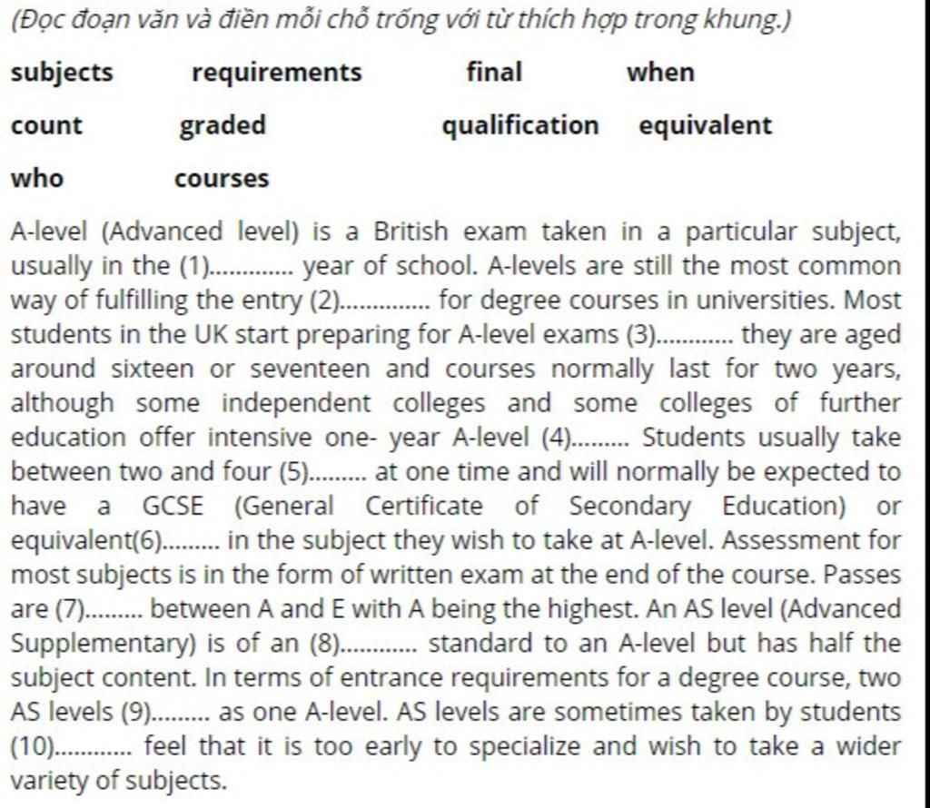 -level (Advanced level) is a British exam taken in a particular subject, usually in the (1) final year of school. A-levels are still the most common way of fulfilling the entry (2) requirements for degree courses in universities. Most students in the UK start preparing for A-level exams (3)when they are aged around sixteen or seventeen and courses normally last for two years, although some independent colleges and some colleges of further education offer intensive one-year A-level (4) courses. Students usually take between two and four (5) subjects at one time and will normally be expected to have a GCSE (General Certificate of Secondary Education) or equivalent (6) qualification in the subject they wish to take at A-level. Assessment for most subjects is in the form of written exam at the end of the course. Passes are (7) graded between A and E with A being the highest. An AS level (Advanced Supplementary) is of an (8) equivalent standard to an A-level but has half the subject content. In terms of entrance requirements for a degree course, two AS levels (9)count as one A-level. AS levels are sometimes taken by students (10) who feel that it is too early to specialize and wish to take a wider variety of subjects.