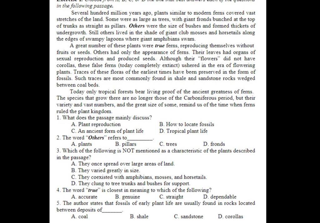 1. C (Several hundred million years ago, plants similar to modern ferns covered vast stretches of the land...)