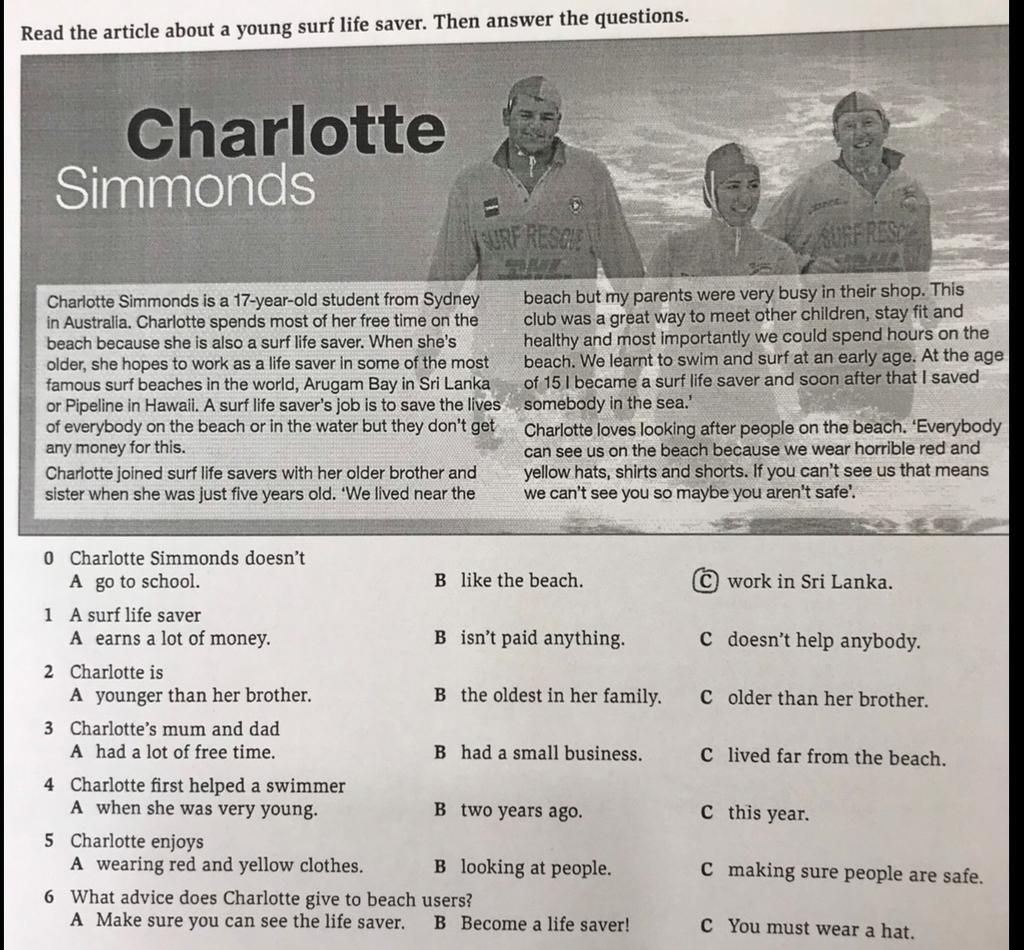 5. C (Charlotte loves looking after people on the beach. "Everybody can see us on the beach because we were....aren't safe)