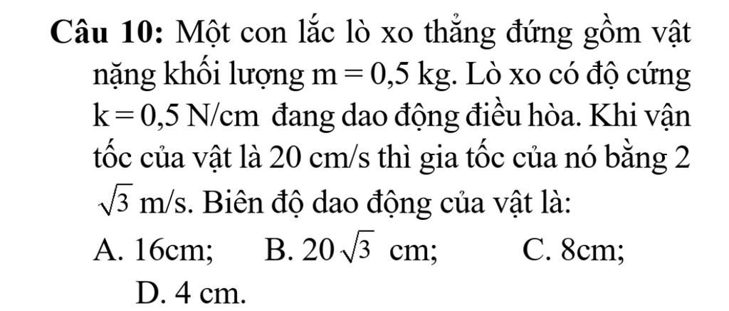\[\omega = \sqrt {\frac{k}{m}} = \sqrt {\frac{{50}}{{0,5}}} = 10\]