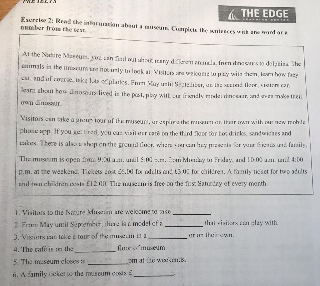 =>From May to September, on the second floor, visitors can learn about dinosaurs lived in the past, play with our friendly model dinosaur, and even make their own dinosaur.(câu số 3 trong bài)