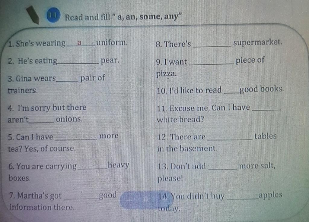 $\text{→}$ onions có -s nên ko dùng a/ an; any dùng với câu phủ định hoặc câu hỏi $\text{→}$ any