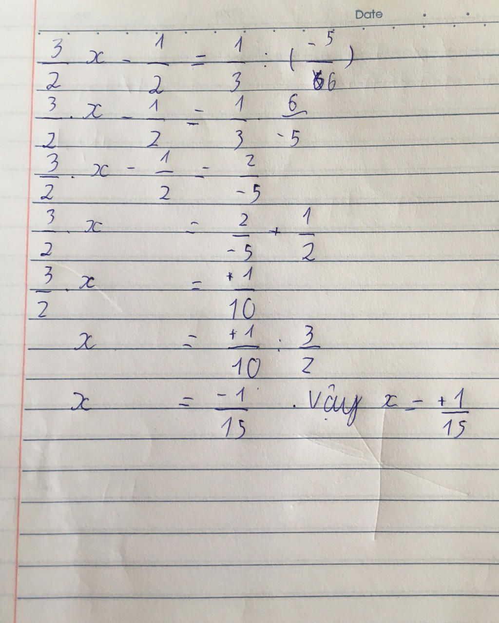 `3/2x - 1/2 = 1/3 . 6/-5`