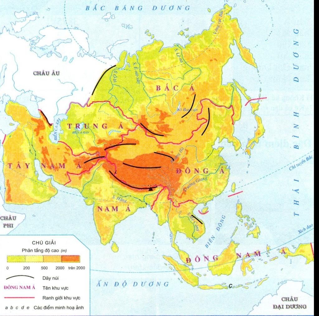 - Dãy núi: Hi-ma-lay-a, U – ran, Côn Luân, Hin-đu-cuc, Thiên Sơn, Nam Sơn, Trường Sơn, Đại An Hưng, Cap-ca, An –tai, La-blô-nô-vôi