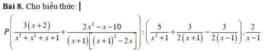 + Biểu thức trong ngoặc đầu A = $\frac{3×(x+2)}{x³+x²+x+1}$ + $\frac{2x²-x-10}{(x+1)×((x+1)²-2x)}$