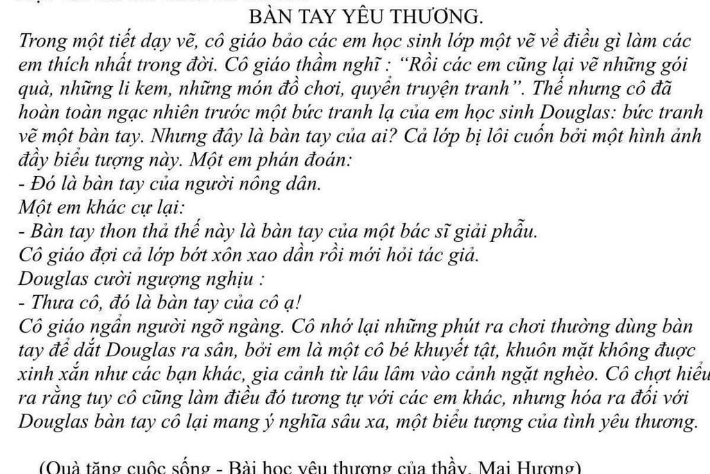 Cô giáo đã yêu cầu học sinh vẽ theo chủ đề điều gì làm các em thích nhất trong đời vì cô thầm nghĩ các bạn sẽ vẽ những gói quà, những ly kem hoặc những món đồ chơi, quyển truyện tranh.Thế nhưng bức tranh của bạn Douglas lại vẽ 1 bàn tay. Điều đó bàn tay cô có ý nghĩa sâu xa, một biểu tượng của tình yêu thương đối với Douglas.