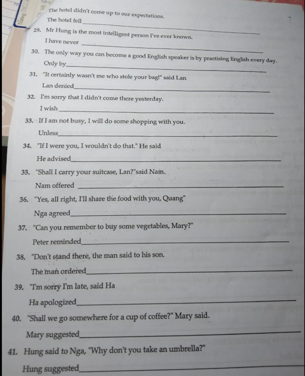 1. The hotel fell short of our expectations. ( Khách sạn không được như chúng tôi mong đợi. )