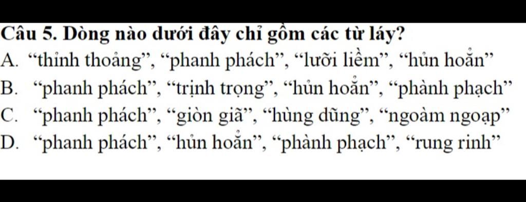 Câu `5` : Dòng nào dưới đây chỉ gồm các từ láy `?`