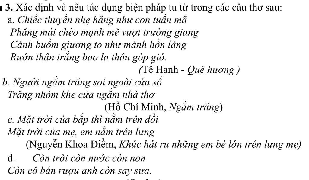 a.- Biện pháp tu từ là : so sánh, nhân hóa. Tác giả so sánh "chiếc thuyền hăng như con tuấn mã, to như mảnh hồn làng"; nhân hóa ở câu thơ "rướn thân trắng bao la thâu góp gió''.