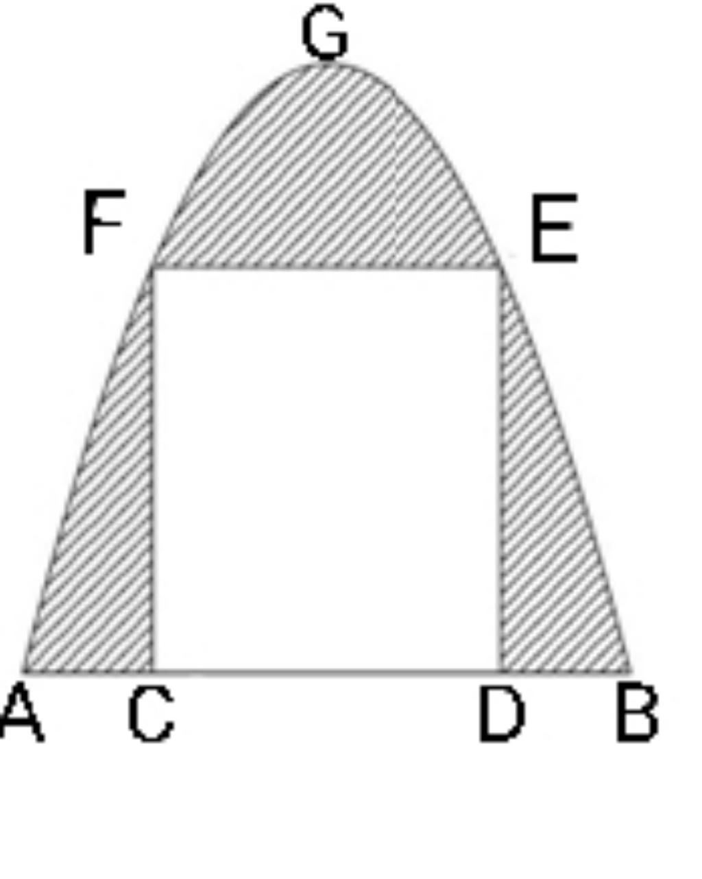 Một chiếc cổng có hình dạng là một parabol bao gồm 1 cửa chính hình chữ nhật ở giữa và hai cánh cửa phụ hai bên như hình vẽ. Biết khoảng cách giữa hai điểm A và B bằng 8m, còn kích thước cửa ở giữa là cao 3m x rộng 4m , hãy tính chiều cao cổng parapol