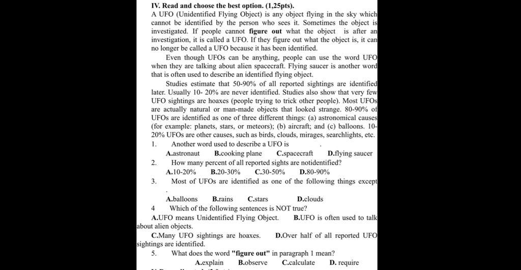4.B. UFO is often used to talk about alien object. ( UFO thường được dùng để nói về vật thể ngoài hành tinh. )