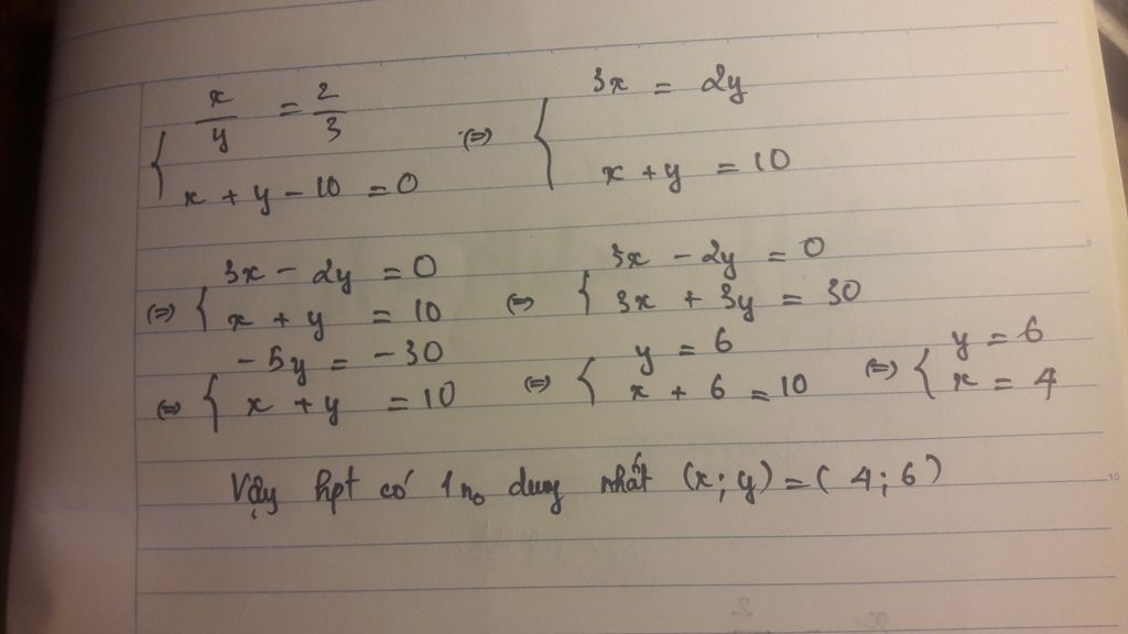 x/y=2/3 ==> x=2y/3 thay vào pt thứ hai ta được: 2y/3+y-10=0 <=> y=6 ==> x=(2.6)/3=4
