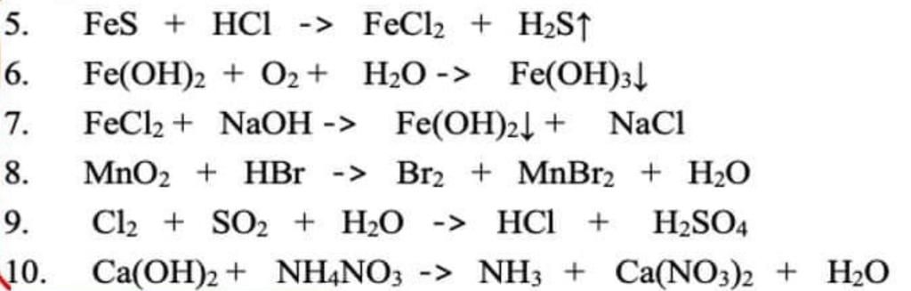`\text{5. FeS + 2HCl → }`$FeCl_{2}+$ $H_{2}S$↑