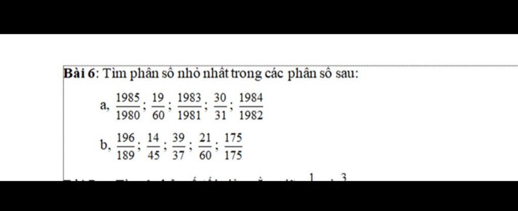 Giải thích: các phân số lớn hơn 1 vì tử lớn hơn mẫu, bằng một khi tử và mẫu bằng nhaudùng phân số trung gian để tìm ra phân số nhỏ nhất