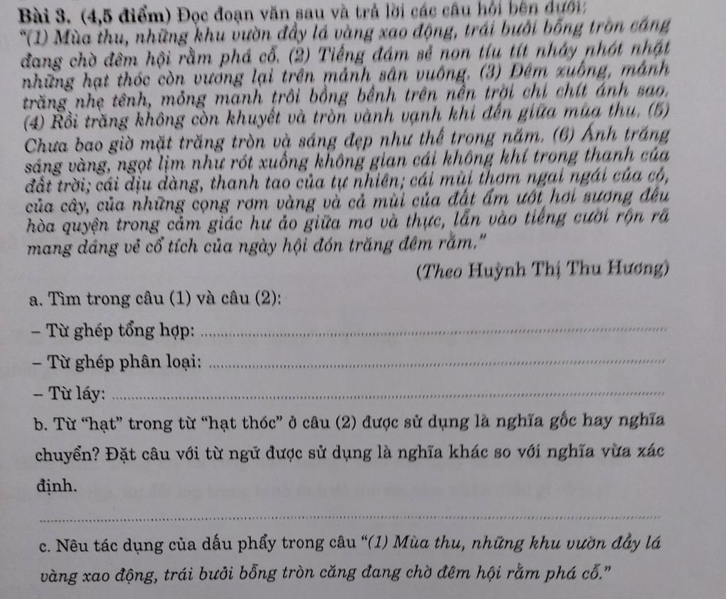 - Từ ghép phân loại : Mùa thu, hội rằm, hạt thóc, phá cỗ, trái bưởi, sẻ non.