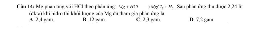 PTHH : `Mg+2HCl→MgCl_2+H_2↑`