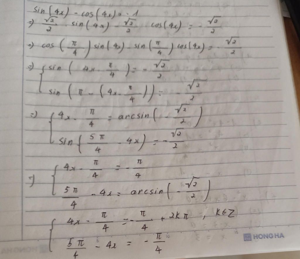 · PT (*) ⇔ $\frac{1}{\sqrt[]{2}}$sin 4x - $\frac{1}{\sqrt[]{2}}$cos 4x = $-\frac{1}{\sqrt[]{2}}$