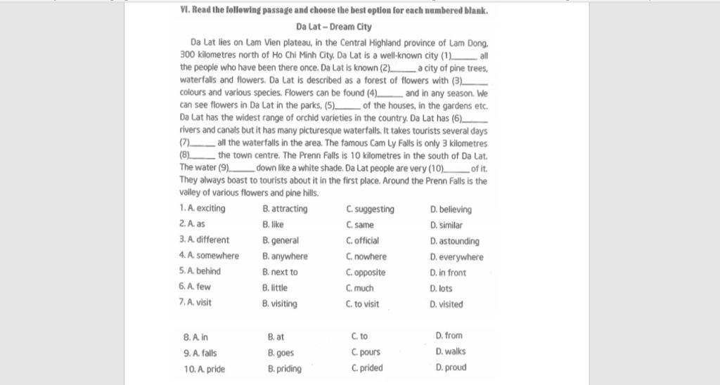 Da Lat lies on Lam Vien plateau, in the central highland province of Lam Dong. Da Lat is a well-known city attracting all the people who have been there once. DaLat is known as a city of pine trees,waterfalls and flowers. Da Lat is described asa forest of flowers with different colors and variousspecies. Da Lat has the widestrange of orchid varieties in the country. Da Lat has few rivers and canalsbut it has many picturesque waterfalls. The famous Cam Ly Falls is only three kilometers from the towncenter. The Prenn Falls is ten kilometers in the South of Da Lat. The water pours down like a whiteshade. Da Lat people are very proud of it. They always boast to tourists about it in the first place. đoạn văn
