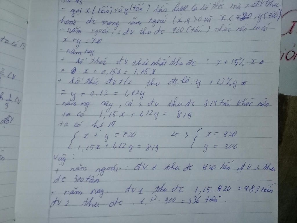 Năm ngoái, hai đơn vị sản xuất nông nghiệp thu hoạch được 720 tấn thóc nên ta có pt: