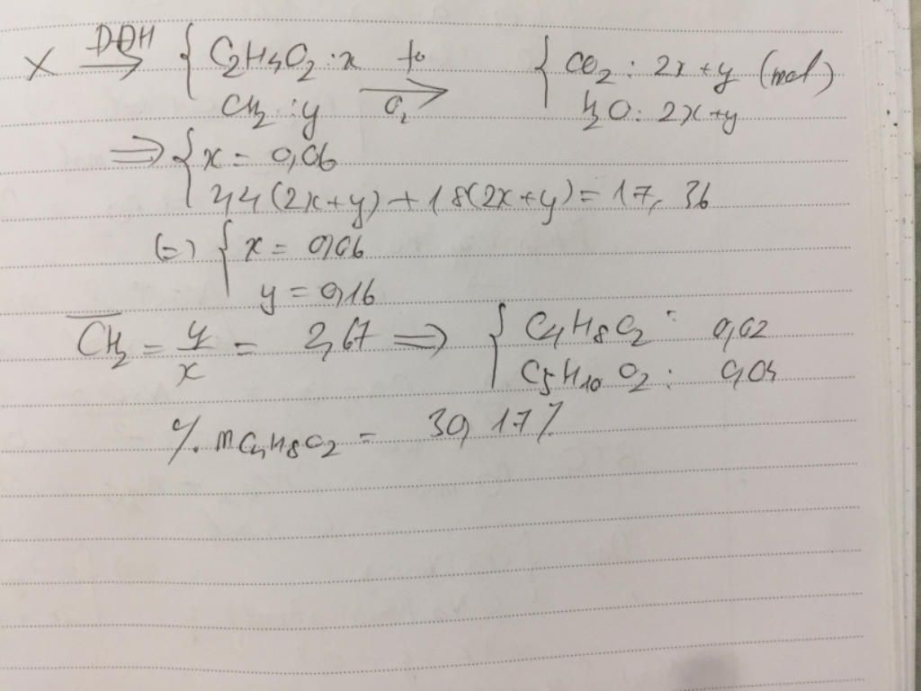 Từ `(1)` và `(2) \to` $\begin{cases} n_{C_4H_8O_2}=a=0,02(mol)\\n_{C_5H_{10}O_2}=b=0,04(mol)\\ \end{cases}$