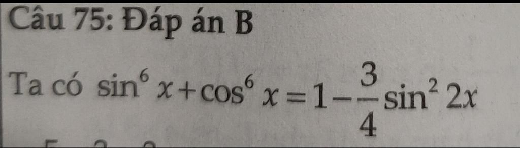 \(\sin^6x+\cos^6x\\=(\sin^2x)^3+(\cos^2x)^3\\=(\sin^2x+\cos^2x)(\sin^4x-\sin^2x\cos^2x+\cos^4x)\\=\sin^4x-\sin^2\cos^2x+\cos^4x\quad\text{(do }\sin^2x+\cos^2x=1)\\=(\sin^4x+2\sin^2x\cos^2x+\cos^4x)-3\sin^2x\cos^2x\\=(\sin^2x+\cos^2x)^2-\dfrac{3}{4}.4\sin^2x\cos^2x\\=1-\dfrac{3}{4}\sin^22x.\)