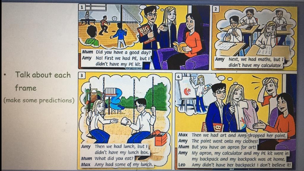 ⇒Tranh 4: Max continued :"Then we had Art and Amy dropped her paint.Max is talking and suddenly Amy speaks up :"The paint went onto my clothes."Mom suddenly said :"But you have you're arpon for art."Amy said :"My arpon,my calculator and my P.E kit are in my backpack and my backpack was at home."Leo said:"Amy didn't have her backpack.I don't believe that.