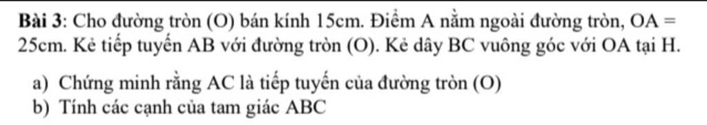 Bài 3: Cho đường tròn (O) bán kính 15cm. Điểm A nằm ngoài đường tròn, OA =