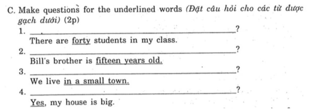 ( vì phần gạch chân nói về số lượng nên ta dùng từ để hỏi là : How many hỏi về số lượng)