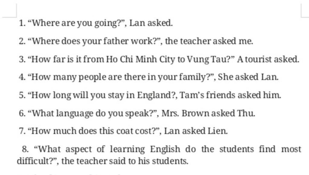 8. The teacher asked his students what aspect of learning English the students found most difficult.