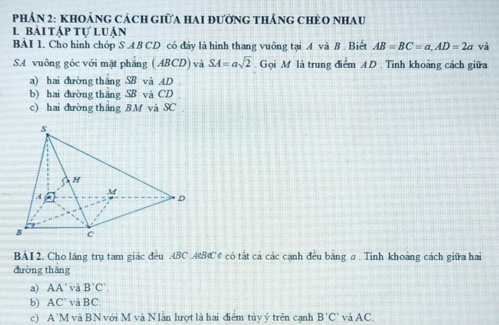 SA vuông góc với mặt phẳng (ABCD) và SA= a 2 Gọi M là trung điếm AD Tinh khoảng cách giữa