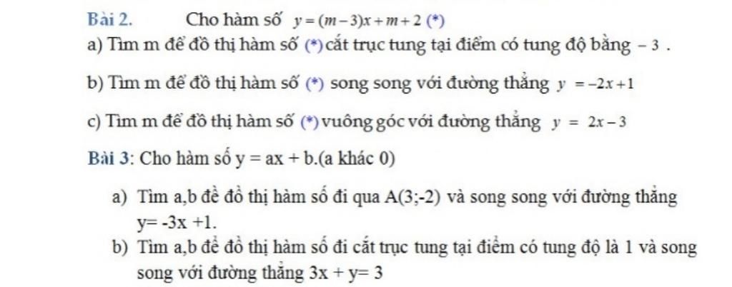 Bài 2: Xét hàm số `y=(m-3)x+m+2` $(*)$