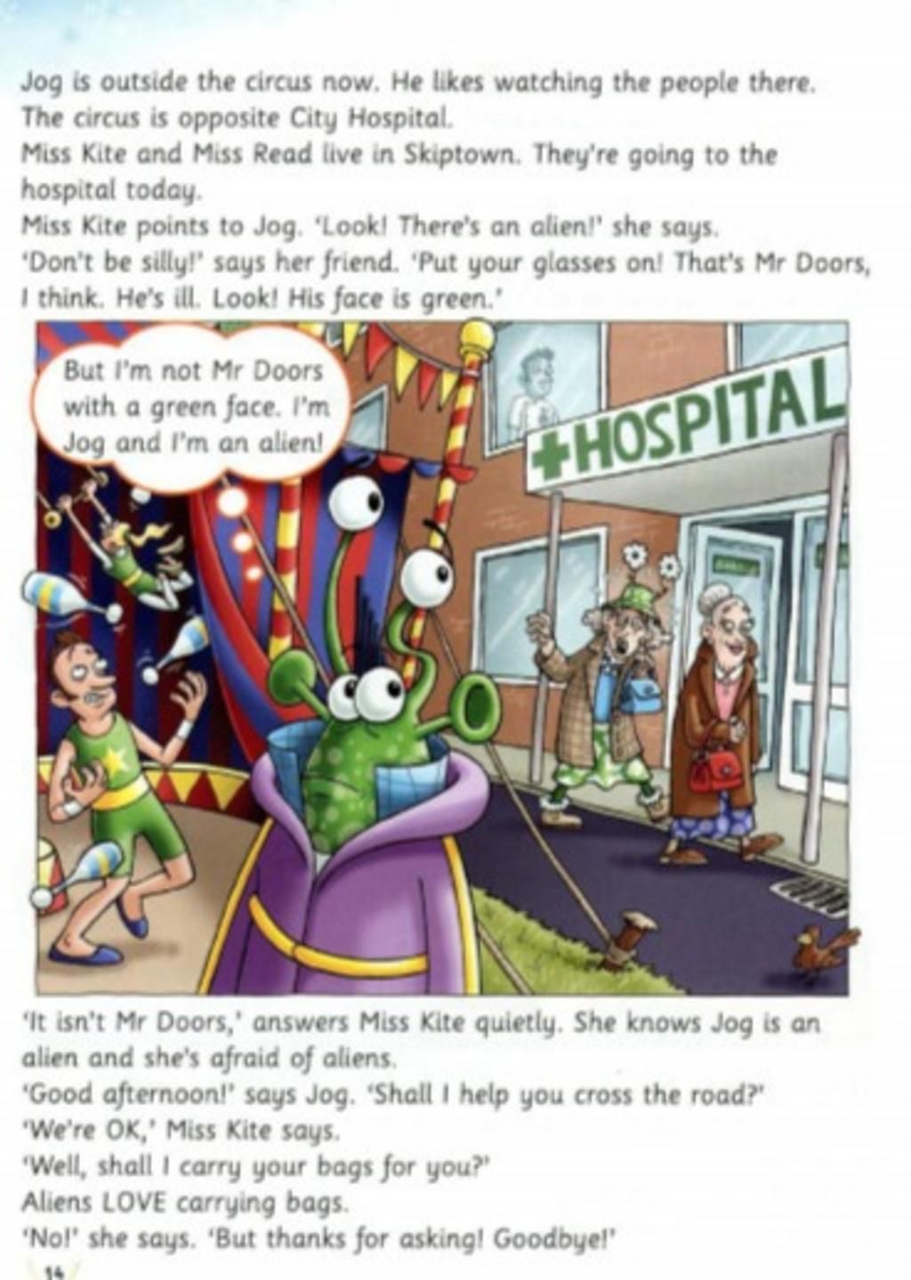 Now Jog is looking to the circus because he likes watching the people in there. Today Miss Kite and Miss Read are going to the hospital because they live in Skip Town. Miss Kite see Jog and said : " Look ! That is an alien ! " But her friend said : " No, that is Mrs. Door, she is ill and look she has green face. " and called Miss Kite to put her glasses down. Miss Kite answer fast when she put her glasses down : " That isn' t Mrs. Door ! " and she know that isd an alien. Then they greet a long time again. And now they have to say " Goodbye " again.