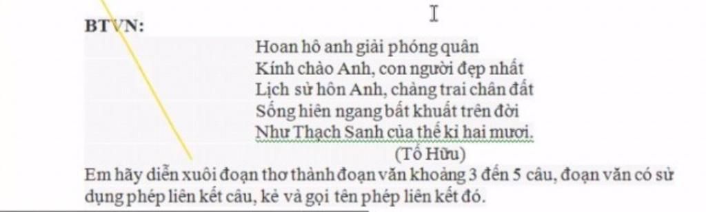 Xin chào anh , anh giải phóng quân . Người đã không ngại xông pha nơi chiến trường để đổi lấy một đất nước bình an . Anh là người đẹp nhất trong lòng mỗi đồng bào Việt Nam . Chiến công của anh được sử sách ghi nhận hỡi chàng trai chân đất giản dị biết bao ! Anh tuy hiên ngang mà bất khuất khiến bao quân thù ngã dưới lưỡi gươm . Điều đó biến anh trở thành Thạch Sanh của thế kỉ 20 .
