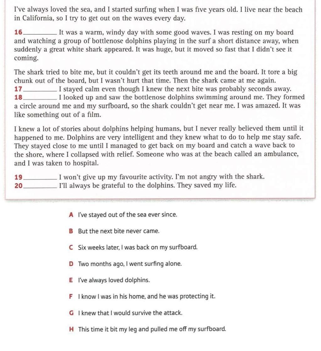 Hai tháng trước, tôi đi lướt sóng một mình. Hôm đó là một ngày ấm áp, có gió nhẹ và sóng rất đẹp. Tôi đang nằm nghỉ trên ván và ngắm một nhóm cá heo mũi chai đang bơi trong làn sóng cách tôi không xa, thì bất ngờ một con cá mập trắng khổng lồ xuất hiện. Nó rất to và di chuyển nhanh đến mức tôi không kịp nhìn thấy nó đang đến gần.