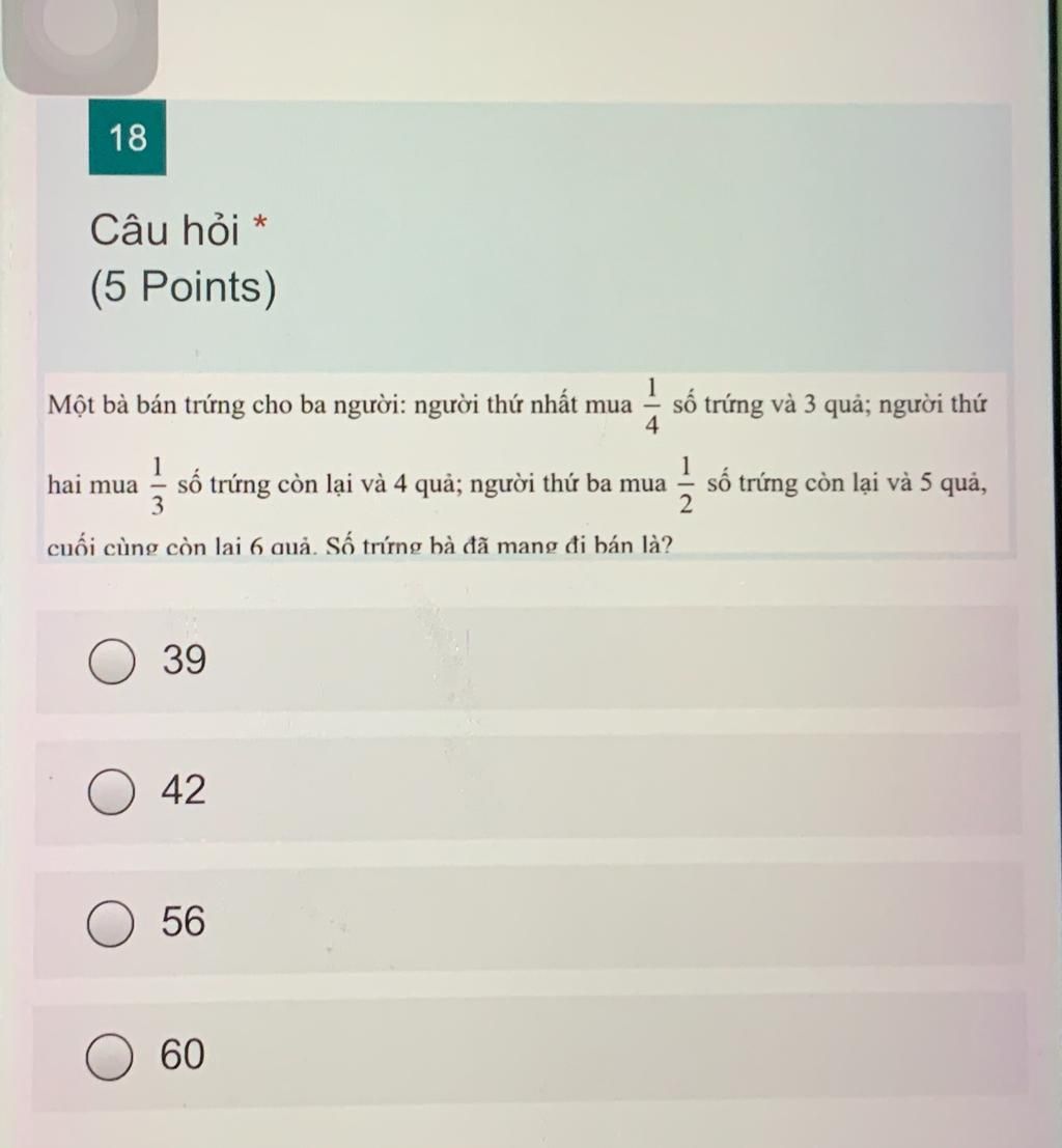 (39 + 3) : (1 - 1/4) = 56 (quả)