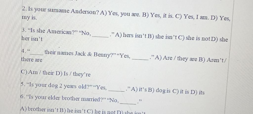 `6` chọn `B` .he isn't(vì có is dứng đầu , chủ ngữ là he)