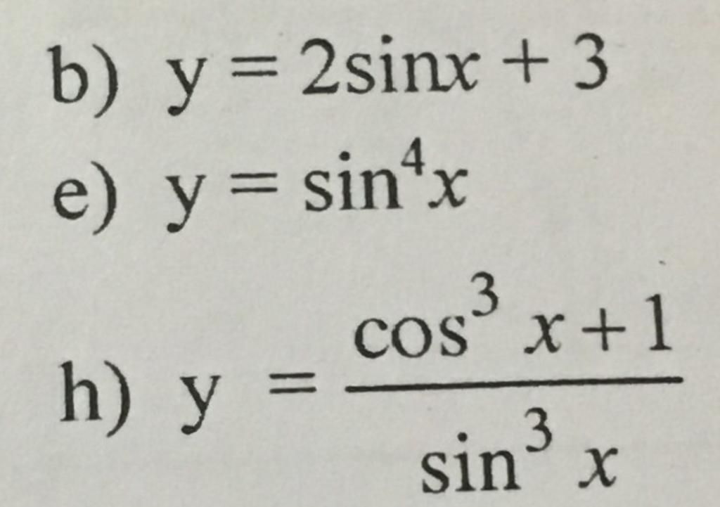\(b)y=2\sin x+3\\+)D=\mathbb{R}\\\text{nên }\forall x\in D\Rightarrow -x\in D.(1)\\+)f(-x)=2\sin(-x)+3\\\quad\quad\quad\quad=-2\sin x+3\\\quad\quad\quad\quad\ne \pm f(x).\quad(2)\\\text{Từ (1) và (2)}\Rightarrow f(x)\text{ không chẵn không lẻ.}\\e)y=\sin^4x\\+)D=\mathbb{R}\\\text{nên }\forall x\in D\Rightarrow -x\in D.(1)\\+)f(-x)=\sin^4(-x)\\\quad\quad\quad\quad=\sin^4x\\\quad\quad\quad\quad=f(x).\quad(2)\\\text{Từ (1) và (2)}\Rightarrow f(x)\text{ là hàm số chẵn.}\\h)y=\dfrac{\cos^3x+1}{\sin^3x}\\+)ĐKXĐ:\sin x\ne 0\\\Leftrightarrow x\ne k\pi.(k\in\mathbb{Z})\\\Rightarrow D=\mathbb{R}\backslash\{k\pi|k\in\mathbb{Z}\}\\\Rightarrow \forall x\in D\text{ thì }-x\in D.(1)\\+)f(-x)=\dfrac{\cos^3(-x)+1}{\sin^3(-x)}\\\quad\quad\quad\quad=-\dfrac{\cos^3x+1}{\sin^3x}\\\quad\quad\quad\quad=-f(x).\quad(2)\\\text{Từ (1) và (2)}\Rightarrow f(x)\text{ là hàm số lẻ.}\)