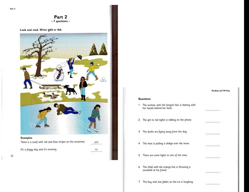 ⇒ Cậu bé đấy có mũ đỏ và đang ném tuyết vào người tuyết.