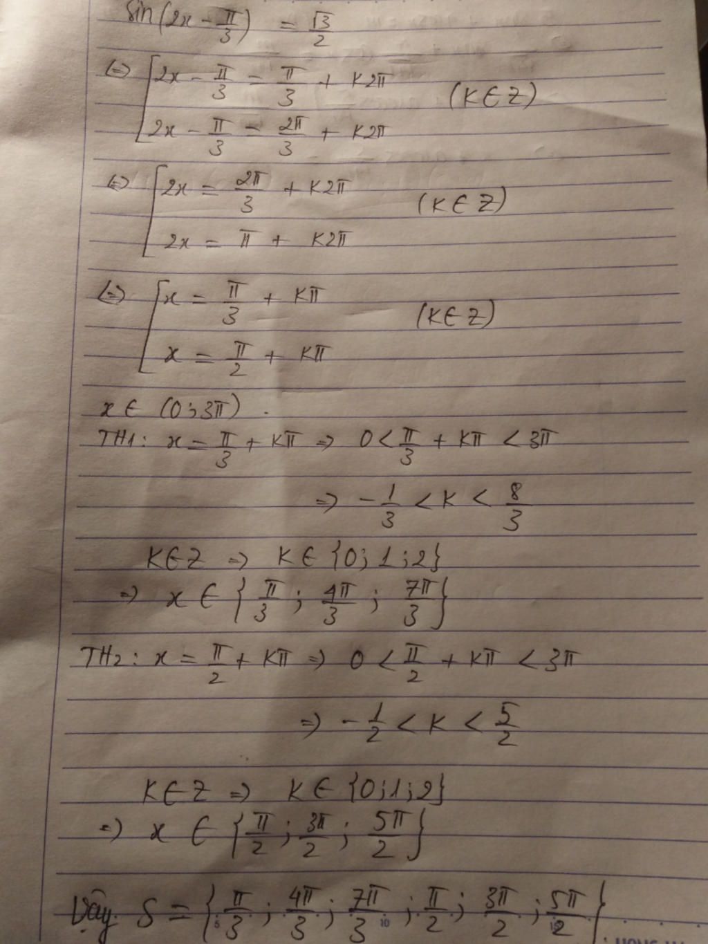 +) `0<x=π/3+kπ<3π` `\quad (k\in ZZ)`