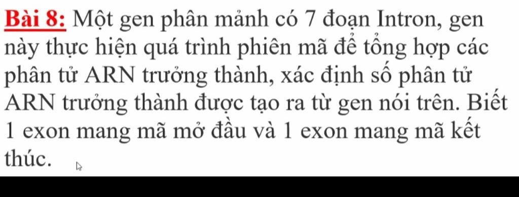 Do vùng mã hóa của gen phân mảnh bắt đầu bằng $1$ đoạn exon và kết thúc cũng bằng $1$ đoạn Exon⇒Gen có $7$ đoạn Intron ⇒ có $8$ đoạn Exon