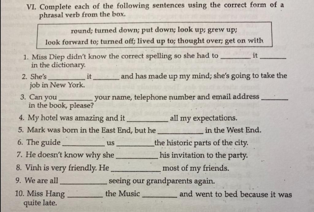 8. gets on with (get on with sb: có mối quan hệ tốt với ai)