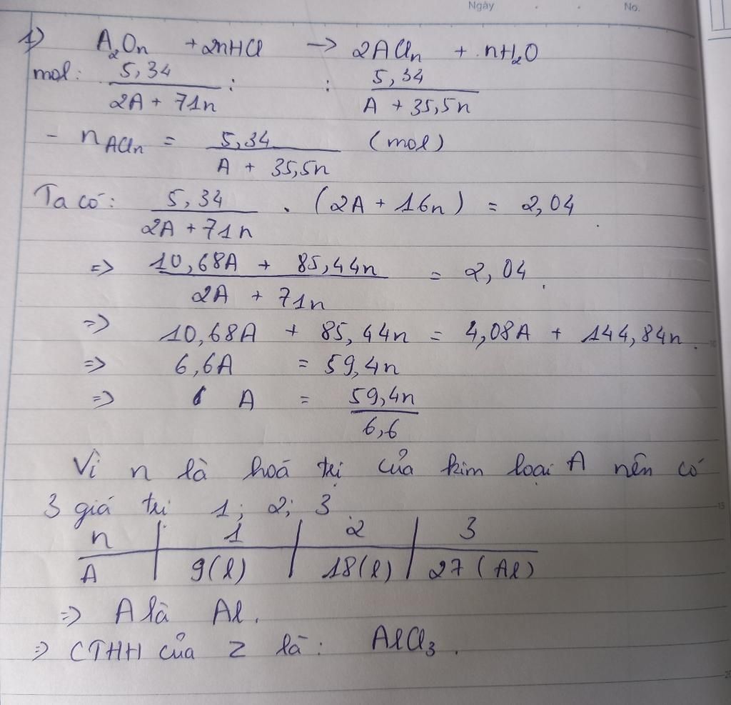 Bài 1. Z là một oxit có công thức: A2On trong đó A là kim loại. Nếu lấy 2,04 gam oxit Z cho tác dụng với dd HCl dư thì sau pứ đem cô cạn dd thì thu được 5,34 gam muối khan. Hãy xác định CTHH của Z.